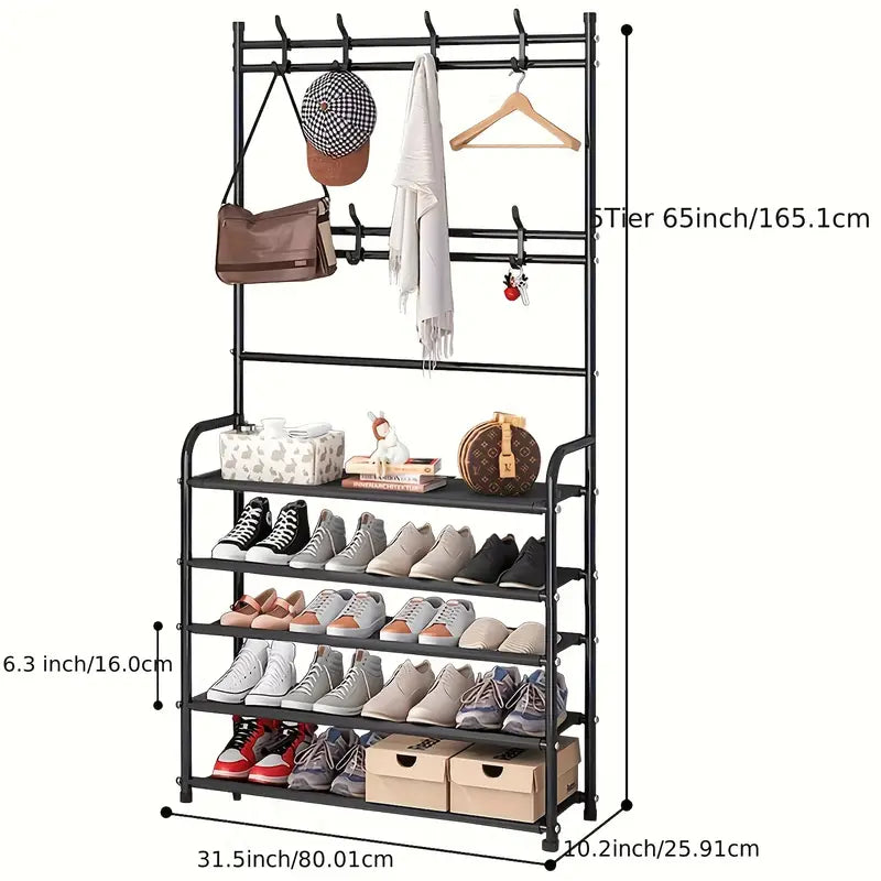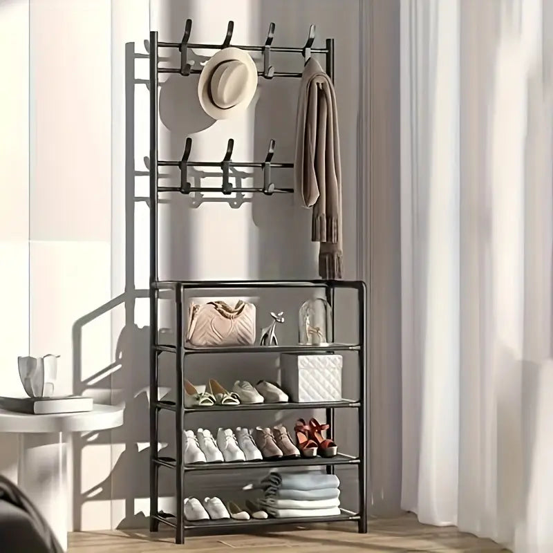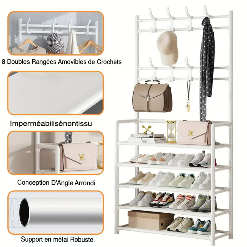 Ce meuble polyvalent combine un porte-chaussures pratique, des crochets pour manteaux et une structure robuste en fer, pour un rangement complet en un seul produit. Parfait pour accueillir les chaussures, manteaux, sacs et autres accessoires dès l'entrée, cet organisateur est idéal pour garder votre espace bien rangé, fonctionnel et accueillant.
